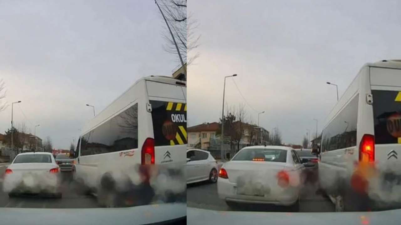 İftar saatine yakın yoğunlaşan trafikte sabırsızlanan bir okul servisi sürücüsünün tehlikeli şerit değiştirme girişimi araç kamerasına yansıdı.