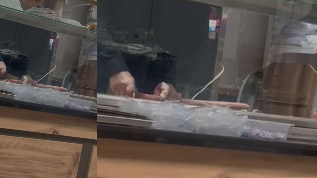 Düzce Üniversitesi Araştırma Hastanesi kantininde, bir çalışan elindeki kanlı yara olmasına rağmen sucuk doğramaya devam etti.