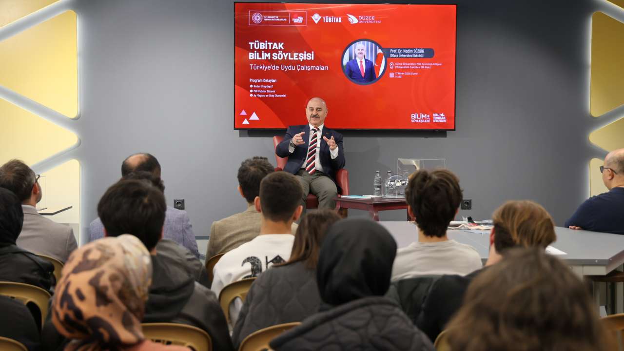 Düzce Üniversitesi Rektörü Prof. Dr. Nedim Sözbir, TÜBİTAK Bilim Söyleşisi kapsamında Milli Teknoloji Atölyesi’nde öğrencilerle bir araya gelerek “Türkiye’de Uydu Çalışmaları” konusundaki bilgi ve deneyimlerini paylaştı.